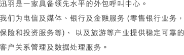 迅羽擁有豐富的客服中心建設及管理實務經驗,熟悉各行業的運營情況,為客戶提供一站式的電話數據處理解決方案。